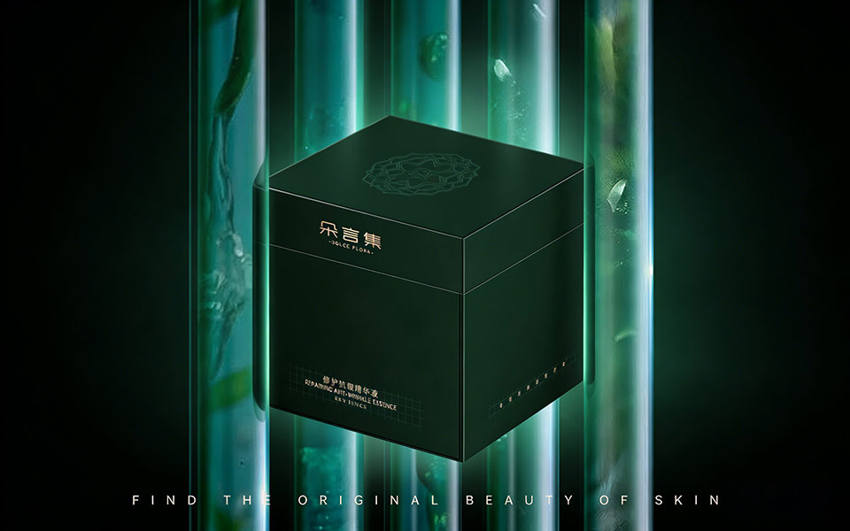 圖形元素:盒面隱藏植物紋理暗紋,呼應「FLORA(植物)」命名,低調傳遞天然植萃核心成分;配套視覺物料采用綠色能量球、試管背景,強化「科技植萃、高效修護」的功效感知,搭配英文slogan「FINDTHEORIGINALBEAUTYOFSKIN」,提升國際化傳播力。