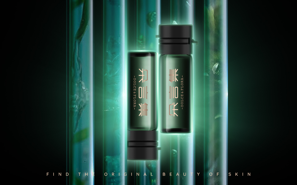 圖形元素:盒面隱藏植物紋理暗紋,呼應(yīng)「FLORA(植物)」命名,低調(diào)傳遞天然植萃核心成分;配套視覺物料采用綠色能量球、試管背景,強化「科技植萃、高效修護」的功效感知,搭配英文slogan「FINDTHEORIGINALBEAUTYOFSKIN」,提升國際化傳播力。