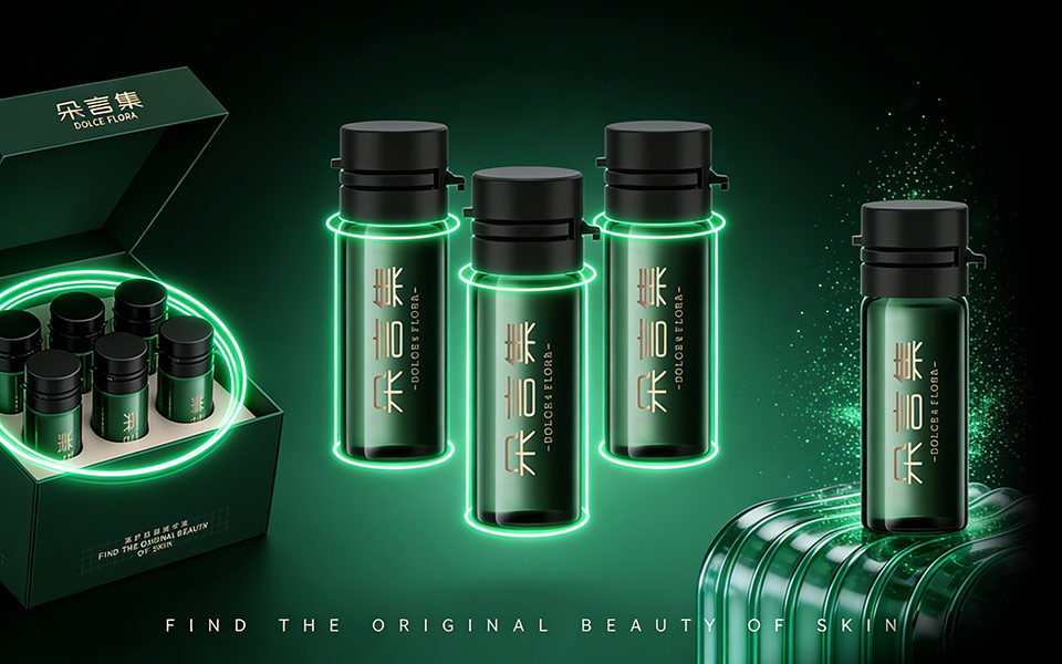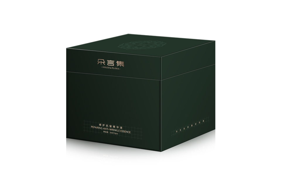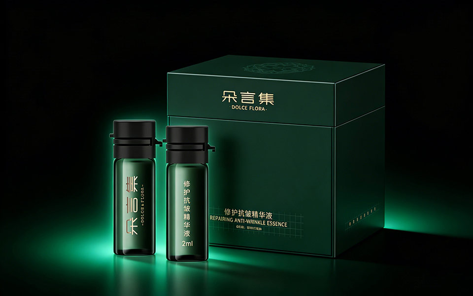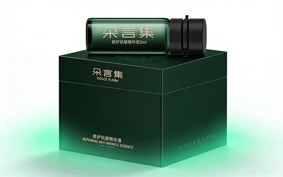 由宏洛圖品牌設(shè)計打造的朵言集(DOLCE&FLORA)修護抗皺精華液包裝,以「天然植萃+科技抗皺+東方雅致」為核心定位,實現(xiàn)功能價值與情感價值的雙重傳遞。