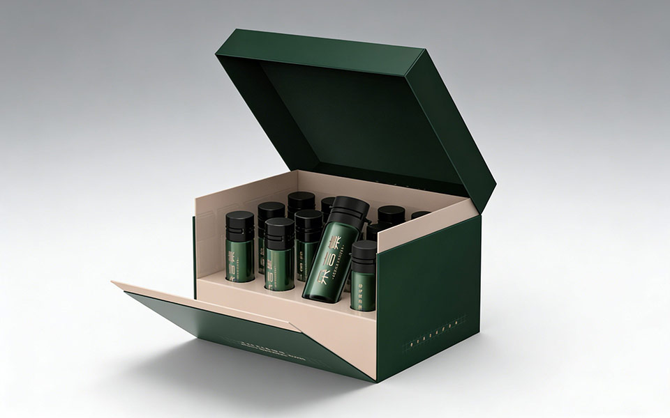禮盒結(jié)構(gòu):采用天地蓋+分層內(nèi)托設(shè)計,開盒儀式感強,同時固定瓶身防止運輸晃動,既滿足個人使用需求,也適配高端禮贈場景。